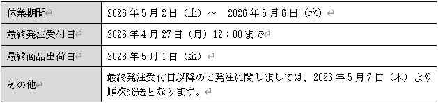 連休に伴い、物流量の増加による納期延滞が予測されます。配送面において、ご迷惑をかけることのないよう、最善を尽くし手配致しますが、何卒ご理解のうえ、以下ご協力を賜りたくお願い申し上げます。